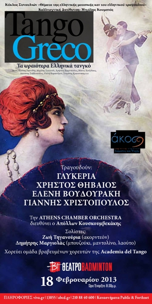 Σας καλούμε λοιπόν να στηρίξετε με την παρουσία σας τη μουσική παράσταση Tango Greco, που θα λάβει χώρα τη Δευτέρα 18 Φεβρουαρίου στις 20.30 στο θέατρο Badminton.