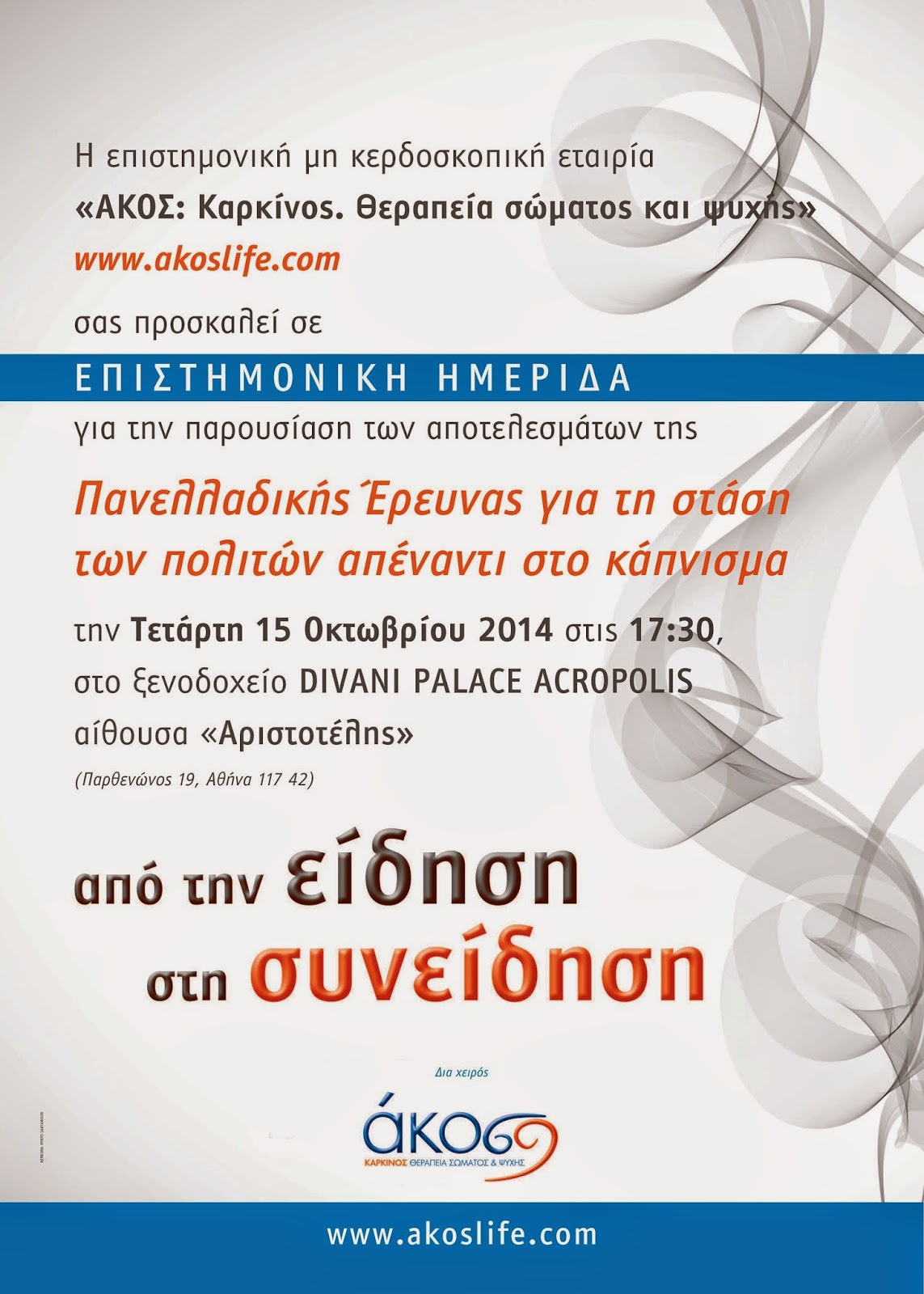 Η ΑΚΟΣ διενήργησε έρευνα με την οποία χαρτογραφεί τις συνήθειες των καπνιστών κάθε ηλικίας, τους λόγους για τους οποίους υιοθέτησαν αυτήν την βλαβερή συνήθεια, τις συνθήκες κάτω από τις οποίες θα την διέκοπταν αλλά και τις πηγές πληροφορησης τους, όσον αφορά το κάπνισμα και τις επιπτώσεις του στην υγεία. Ποιά μέσα επιλέγουν για την ενημέρωση τους; Για ποιούς λόγους καπνίζουν; Κάτω από ποιές συνθήκες θα αποφάσιζαν να σβήσουν μια για πάντα το τσιγάρο τους;