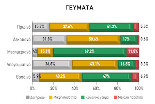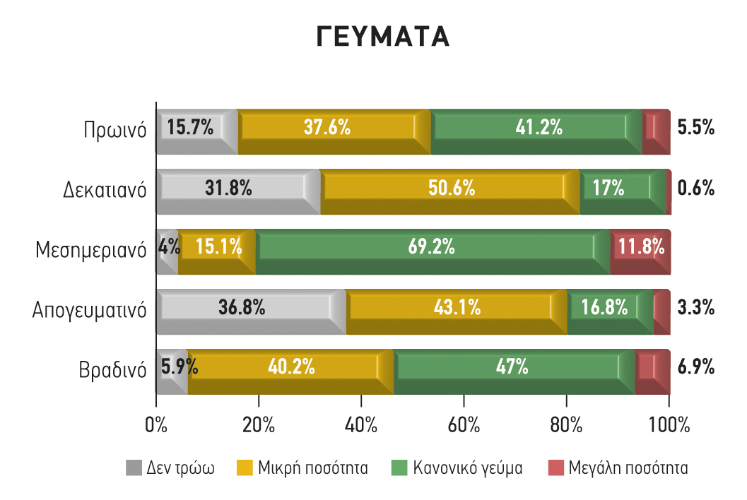 Το 53% των ερωτηθέντων παραλείπουν πρωινό και δεκατιανό. Μόνο 4 στους 10 λαμβάνουν κανονική ποσότητα πρωινού. Κύριο γεύμα είναι το μεσημεριανό (80%) και ακολουθεί το βραδινό (54%)