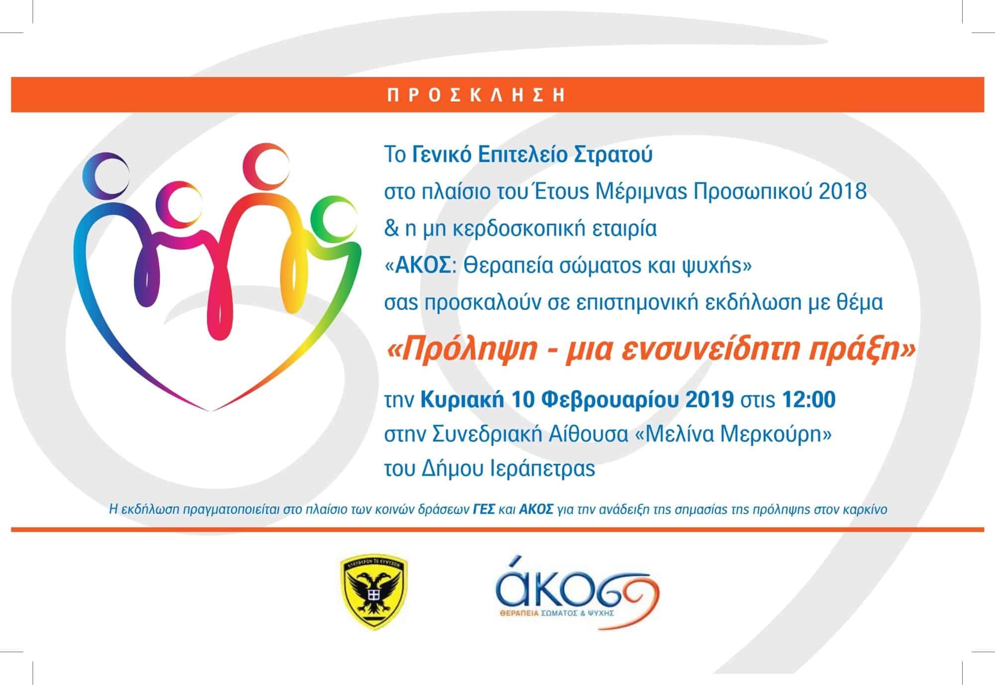 Καμπάνιες Επιστημονικές εκδηλώσεις «Πρόληψη – μια ενσυνείδητη πράξη», Σάββατο 9 Φεβρουαρίου 2019, Αίθουσα «Πολυχρόνης Πολυχρονίδης» Πνευματικού Κέντρου Χανίων, Χανιά Το Γενικό Επιτελείο Στρατού και η μη κερδοσκοπική εταιρία «ΑΚΟΣ: θεραπεία σώματος και ψυχής» στο…Akos-life