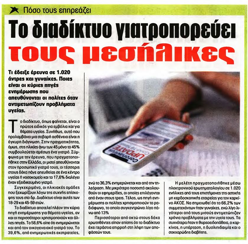 Το διαδίκτυο, όπως φαίνεται, είναι πρώτος ειδικός για εμβόλια και για θέματα υγείας. Συνήθως, αυτό που προλαμβάνει μια σοβαρή ασθένεια είναι έγκυρη διάγνωση. Στην πραγματικότητα, όμως, στις ηλικίες άνω των45 μόνο το 45% συμβουλεύεται αμέσως ένα γιατρό.